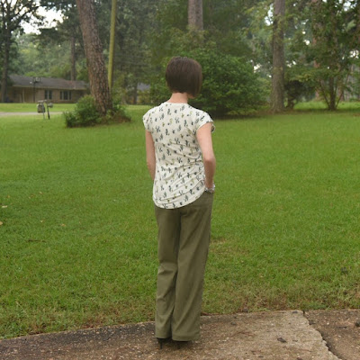 Then several weeks ago, I saw this beautiful olive green twill fabric on sale at my local Joann's Fabrics. Do you know it was on sale for 70% off because it was labeled as a "summer fabric?" Well, I was smart enough to know that it's a year-round color, so I purchased two yards for about $10 and held it, waiting for the right pattern to come along. And... it did! Meet the "Hepburn Pants."
